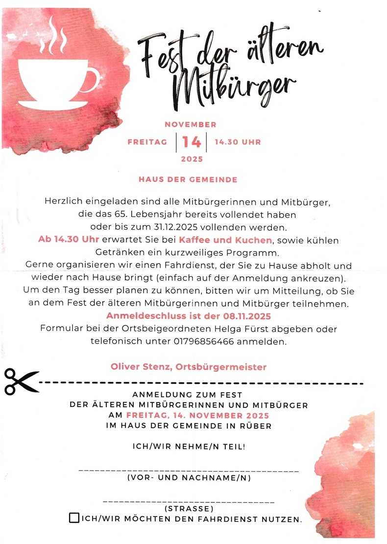 Die Ortsgemeinde Rüber hat die über 65jährigen Mitbürger zum Festtag der „Älteren Mitbürger“ eingeladen. Gegen 14.30 Uhr sind fast alle Plätze im Saal des HdG. besetzt. Ortsbürgermeister Oliver Stenz eröffnete und begrüßte mit herzlichem Worten die Anwesenden. Er gab einen kurzen Überblick über die zurzeit in der Gemeinde anstehenden Sachthemen. Hochwasserschutzgebiet, Entwicklung eines Neubaugebietes, Umgestaltung Dorfplatz, Probleme der Baumscheiben, Glasfaserausbau, Übertragung der Kita an die VG Maifeld- eine schwere Frage. Hauptproblem, die knappen Finanzen der Gemeinde. Er bedankte sich bei allen Ehrenamtlichen die in unserem Dorf durch Ihre Mitarbeit dafür sorgen, dass Rüber lebend - und liebenswert bleibt. Ohne diese Helfer wäre manches, so auch dieses Fest nicht möglich.